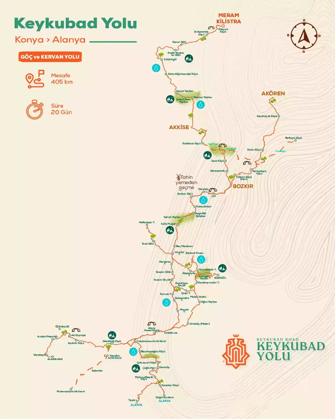 Konya Büyükşehir Belediyesi, Antalya ve Konya Valilikleri iş birliğiyle hayata geçirilen Keykubad Göç ve Kervan Yolu, Anadolu’nun binlerce yıllık tarihini, kültürünü ve doğal güzelliklerini bir araya getiren eşsiz bir proje olarak karşımızda. Toplam 405 km uzunluğundaki bu yol, Selçuklu Sultanı Alaeddin Keykubad’ın fetihlerinden göçerlerin binlerce yıllık izlerine, kervanların ticaret rotalarından Toroslar’ın büyüleyici manzaralarına kadar pek çok hikâyeyi barındırıyor.